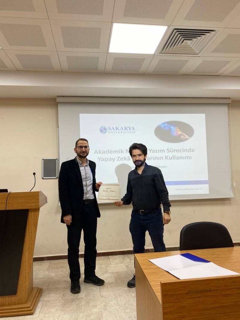 Sakarya Üniversitesi Mühendislik Fakültesi Endüstri Mühendisliği Bölümü Öğretim Elemanı Dr. Öğr. Üyesi Abdullah Hulusi KÖKÇAM tarafından “Akademik Makale Yazım Sürecinde Yapay Zekâ Araçlarının Kullanımı” konulu seminer, 06.12.2023 Çarşamba günü saat 14.00’te Fakültemiz Konferans Salonu'nda gerçekleştirilmiştir. Seminer sonrasında Dr. Öğr. Üyesi Abdullah Hulusi KÖKÇAM'a, Dekan Yardımcımız Dr. Öğr. Üyesi Ömer Faruk CAN tarafından teşekkür belgesi takdim edilmiştir.